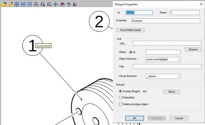 The hotspot capability seems to be very straightforward, but when we investigate further, there is a level of complexity not envisaged. In Part 1 of the blog post we discuss where the addition hotspots can be beneficial. The most likely place to find hotspots is on a spare parts illustration, in the Figure 1 below the callout numbers have been hotspotted. The hotspot can contain various metadata, see the dialog box below for the possible options. The hotspot alone has little functionality apart from the tooltip, ‘Grommet’, in this instance.